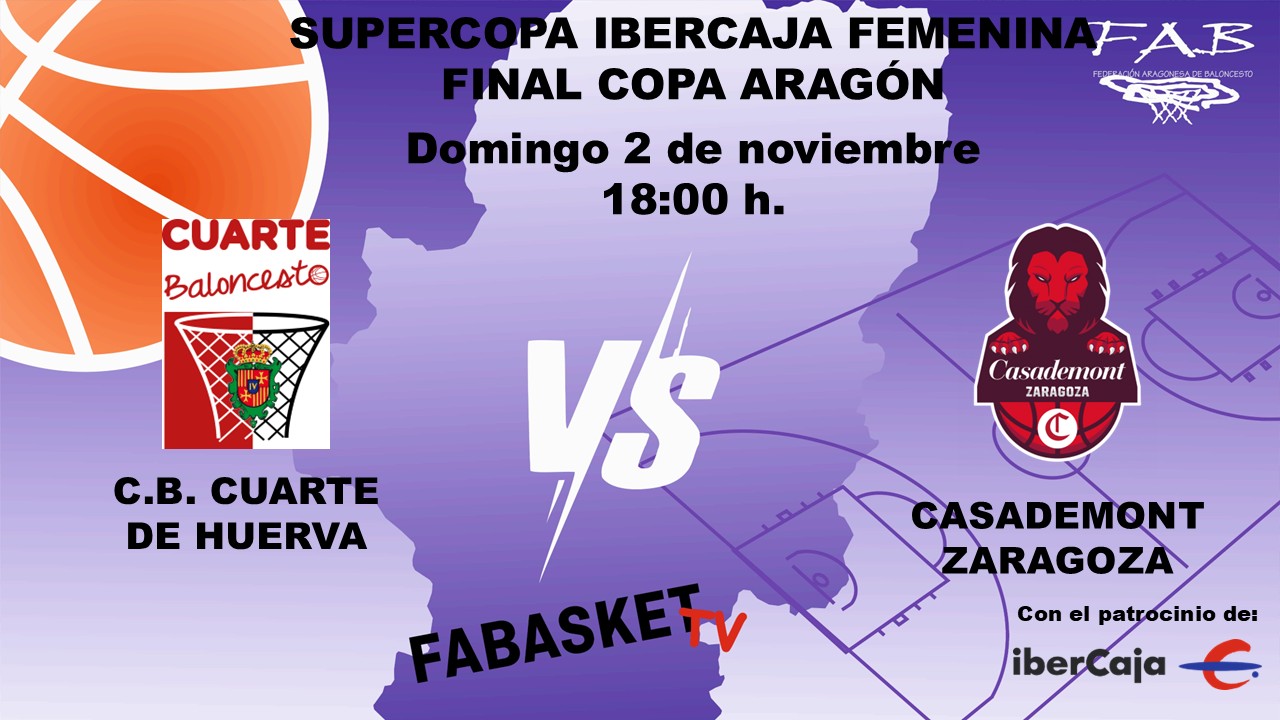 29/10/25 Fabasket TV, el Canal del Baloncesto Aragonés, que está encuadrado en nuestro Youtube, ofrecerá en directo la final de la Copa de Aragón Ibercaja Femenina, que tendrá como protagonistas al Casademont y CB Cuarte Huerva, que se jugará el domingo, 2 de noviembre, 18 horas, en el pabellón de La Puebla de Alfiindén.