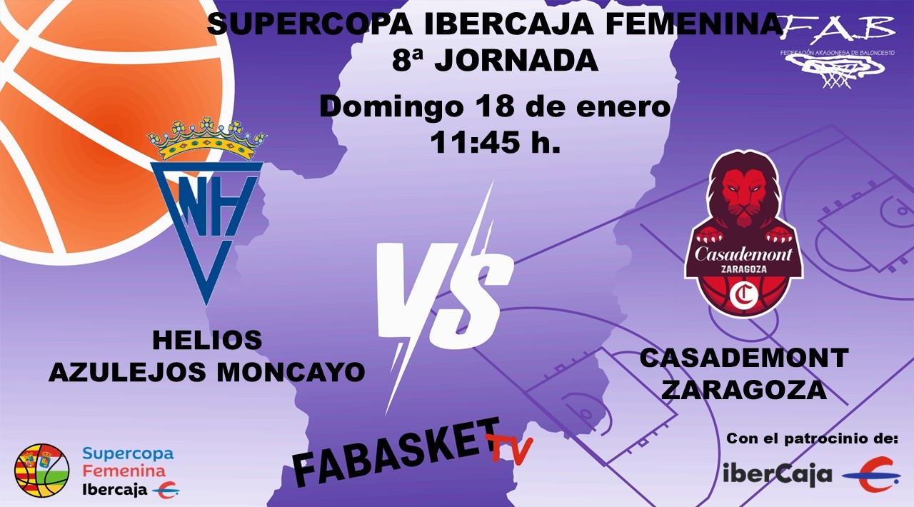14/01/26 Fabasket TV retransmitirá en directo el encuentro de la Supercopa Ibercaja Femenina que enfrentará a Helios Azulejos Moncayo y Casademont Zaragoza, que se jugará el domingo, 18 de enero, a las 11:45 horas, en el pabellón CN Helios, con el patrocinio de Ibercaja.
