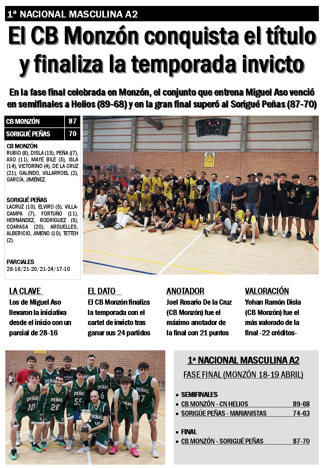 El CB Monzón finaliza la temporada con el cartel de invicto tras haber ganado los 24 partidos que ha jugado y consigue el ascenso a la 1ª Nacional A1.