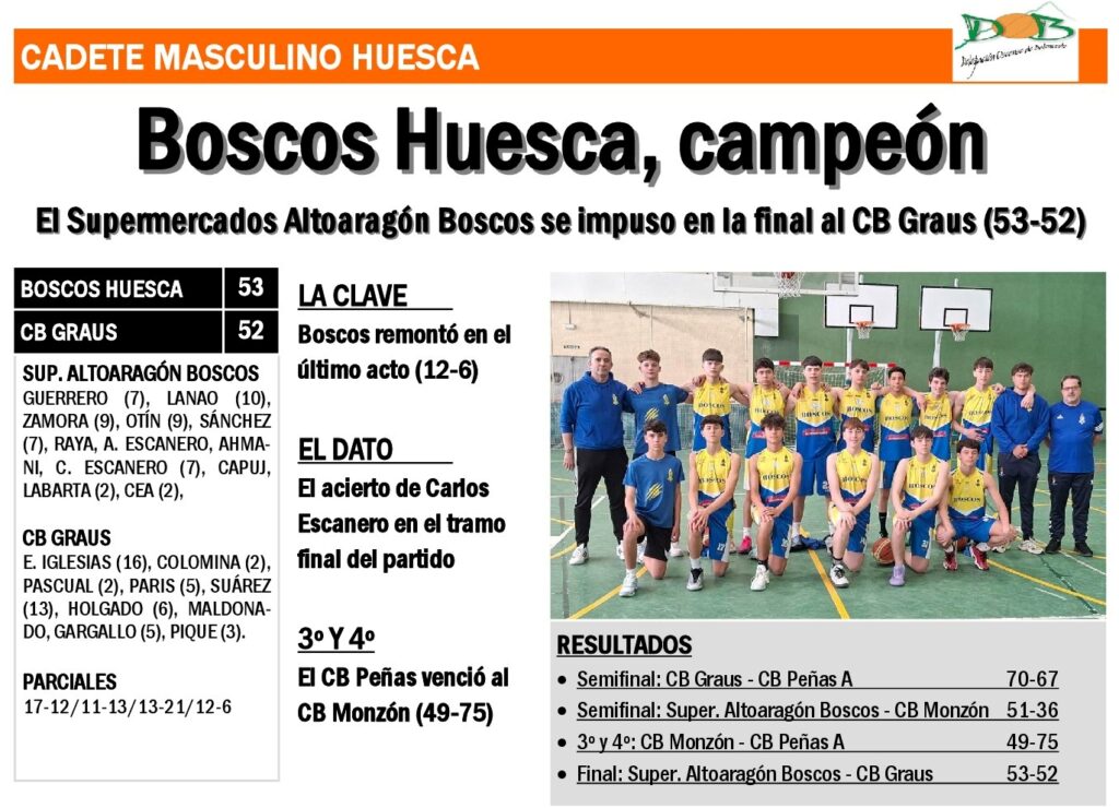 En el encuentro por el tercer y cuarto puesto, el CB Boscos impuso su defensa y el acierto de Lucas Guerrero -17 puntos- para vencer al CB Graus (53-32).