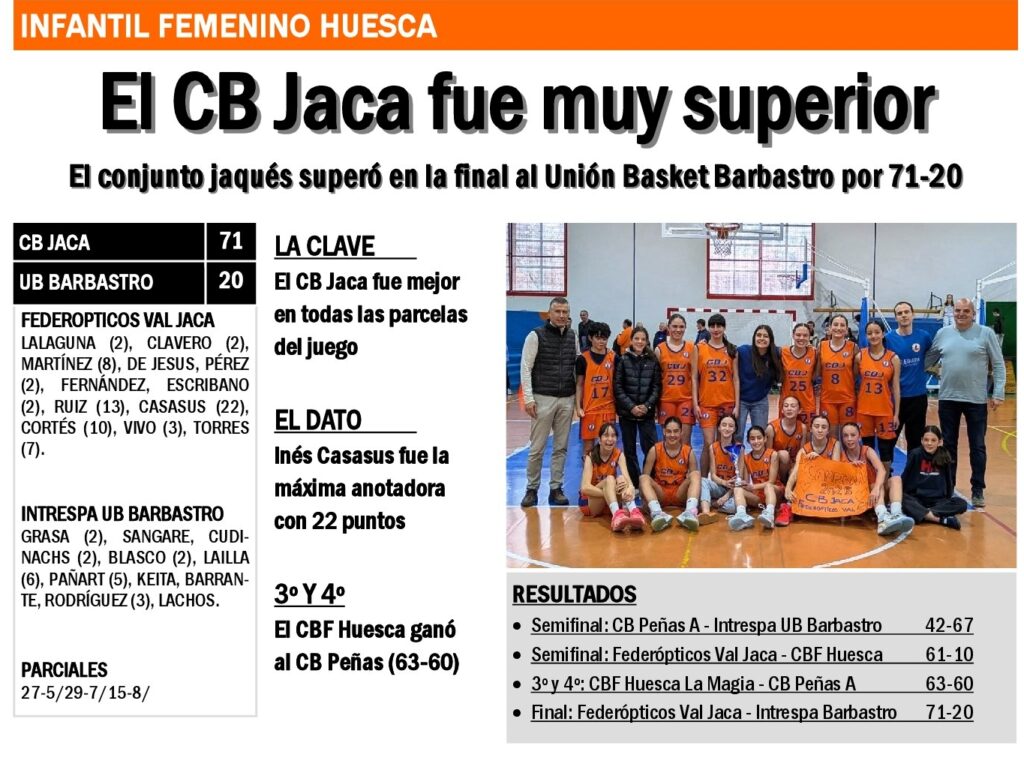 En las semifinales, el CB Monzón se impuso al CB Graus (73-37). Y el Federópticos Val Jaca venció al CBF Huesca La Magia (79-46).