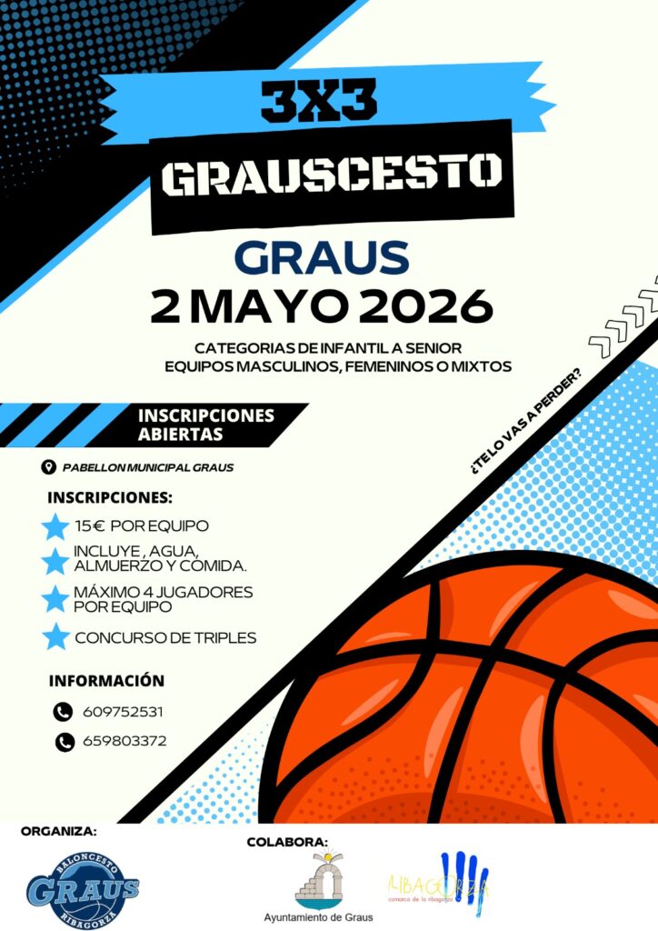 15/04/26 El Club Baloncesto Graus organiza un Torneo 3×3 y un Concurso de Triples, que se celebrará el sábado, 2 de mayo y que está dirigido a equipos de 3 o 4 jugadores/as de las categorías que van desde Infantil hasta Sénior masculinos, femeninos o mixtos.