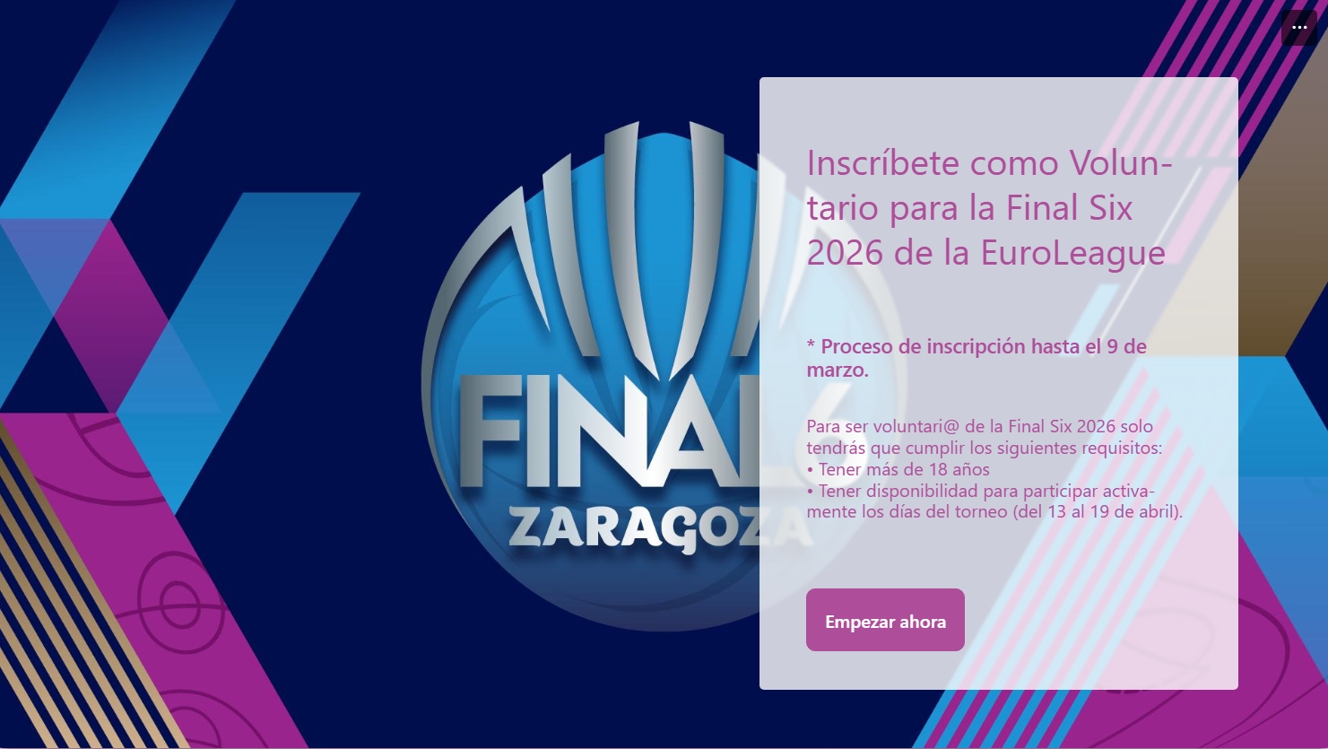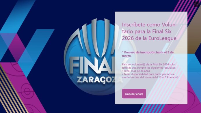 Este año tienes la oportunidad de ser protagonista de uno de los mayores eventos del baloncesto europeo. Únete al equipo de voluntarios que hará posible la FINAL SIX DE LA EUROLIGA FEMENINA 2026, que por segundo año consecutivo se celebrará en Zaragoza. Será del 15 al 19 de abril y ayúdanos a mostrar al mundo la fuerza, la pasión y la hospitalidad de nuestra ciudad.