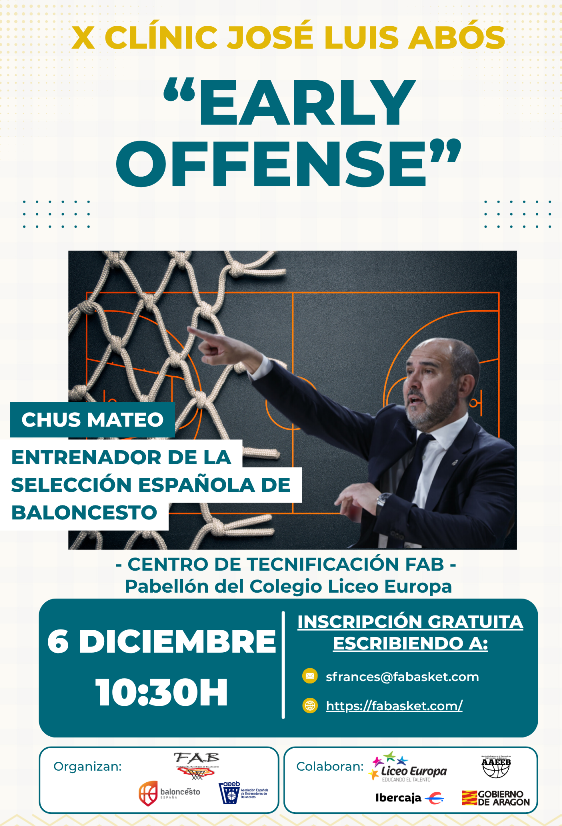 El X Clínic ‘José Luis Abós’ se celebrará el sábado, 6 de diciembre de 2025, a las 10:30 horas, en el pabellón del colegio Liceo Europa-Centro de Tecnificación FAB y contará con un ponente de auténtico lujo, Chus Mateo, seleccionador nacional absoluto masculino, quien ofrecerá una conferencia bajo el título ‘Early Offense’ (llegar jugando).